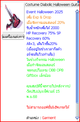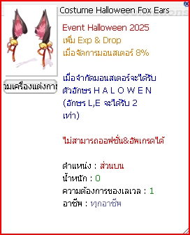 เมื่อสวมใส่คอสตูมที่กำหนดแล้วทำลายมอนสเตอร์จะได้รับไอเทมตัวอักษร H A L O W E N โอกาสดรอป 0.3% ( ตัว L และ E จะดรอปมากกว่าตัวอื่น 2 เท่าหรือ 0.6% ) หลังจากสะสมครบคำว่า HALLOWEEN แล้วก็นำไปหมุนไอเทมฟรีได้ทันทีที่ NPC Morocc 154 132